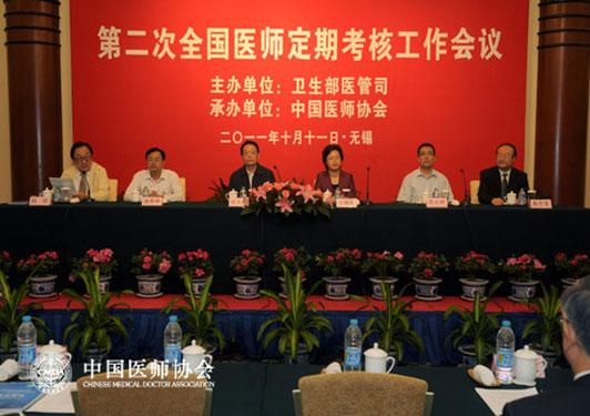 2011年10月11日上午,由卫生部医管司主办,中国医师协会承办的第二次全国医师定期考核工作会议在江苏省无锡市召开。中国医师协会会长殷大奎、卫生部医管司孙阳副司长、卫生部医管司医疗处高光明处长在会议上做重要讲话。无锡市副市长华博雅以及各省级卫生厅局医管(医政)处负责人和医师定期考核办公室负责人等共160余人出席会议。会议由中国医师协会常务副会长兼秘书长杨镜教授主持。